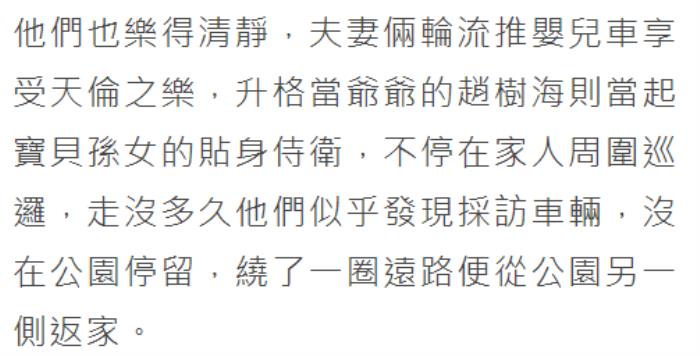全程下来都是赵又廷夫妇轮流推着婴儿车,赵树海只是担任“贴身侍卫”一角,在附近来回巡逻,并很快发现记者的车辆,于是一家人从公园另一侧返家。
