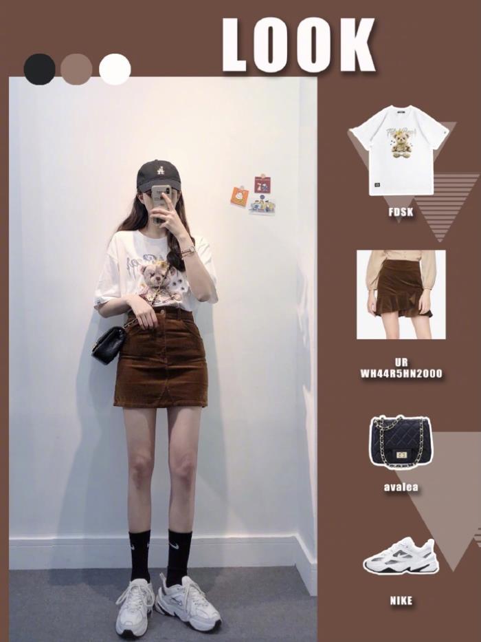玩偶熊印花T恤在今年不要太火,看上去很逼真的打印技术让一件普通的T恤充满了活力与童真。宽松的版型很适合炎热的夏天,透气指数一级棒。下半身选择一条秋冬色系的天鹅绒质感短裙,吗,没有一丝廉价的气息。