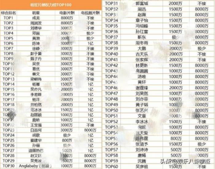 在此之前,曾有某机构通过多方打听并结合市场行情,对明星片酬权力榜进行数据统计,得出了明星片酬TOP100权力榜。