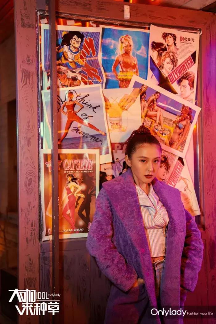 最后化身霓虹女孩~无论哪种风格热依扎都不在话下,大面积亮紫色打破沉闷,破洞牛仔裤让热依扎看起来更加自由与不羁,还有点帅~