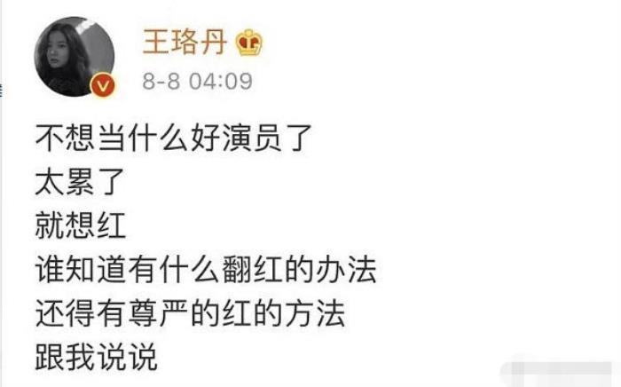 除了这次的素颜曝光备受关注,前不久,一直不温不火的王珞丹在深夜发文称“不想当什么好演员了",因为"太累了,就想红"。还向网友求助有没有什么有尊严的翻红的办法,随后迅速删除,疑似发泄自己的不满情绪,让网友们十分担心。