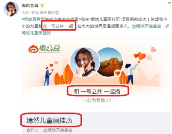 12月6日,海哈金喜与李亚鹏共同向某公益项目捐款成功后,并在社交平台发文艾特李亚鹏的社交账号,称"希望小小的力量在大大的世界温暖更多人",据悉这也是她与李亚鹏首次公开合体参与慈善活动。