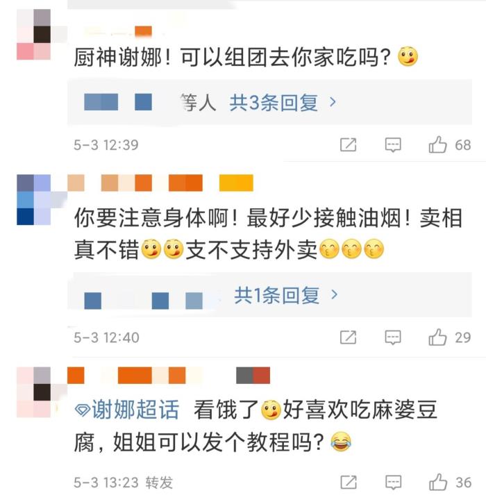 网友看了谢娜晒出的美食,有人表示自己也想吃,求她分享菜谱。也有网友很关心她的身体,叮嘱她少接触油烟,不要太操劳。