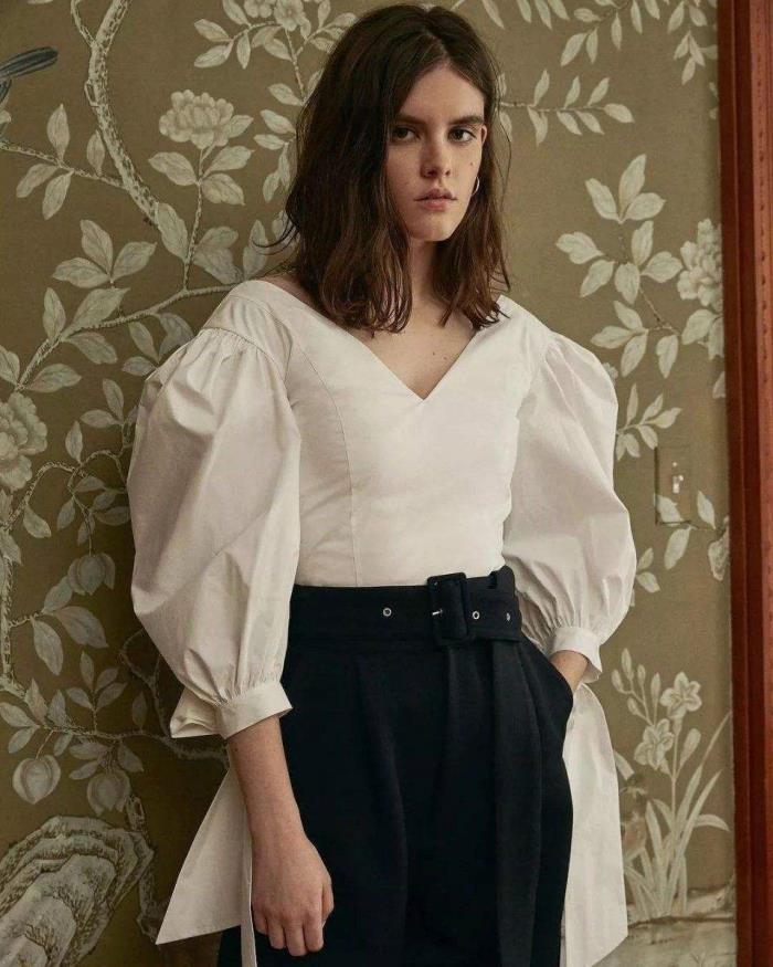 首先,从它的设计上来说的话,尾部设计可以拉长肩膀的长度,直接看图就可以看出来。图片中的模特一看也不属于肩宽类型的,但是她穿上这种设计的泡泡袖,明显她的肩膀就宽了,要是我们肩宽的人会更显的膨胀。