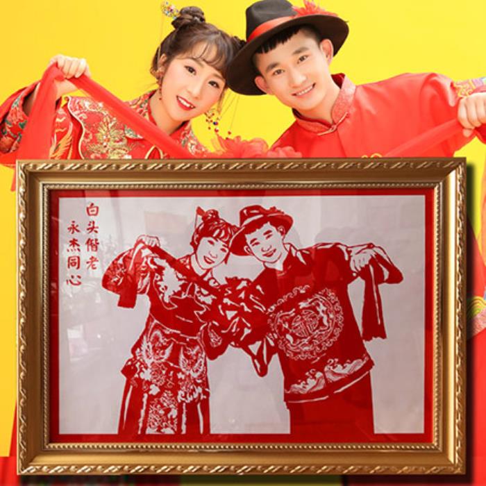 剪纸画像+高档实木相框,传统工艺与现代画法的逼真结合,创新创意的极好应用。送你的闺蜜一个独具风格的结婚照。