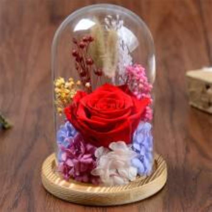 永生花玻璃罩礼盒,花儿摆放错落有致 ,分外迷人。自带七彩的灯光,夜晚亮起非常温馨迷人。玫瑰虽艳,但却易谢,送女友一盒可以永久保存的永生花吧,给她一辈子的浪漫。