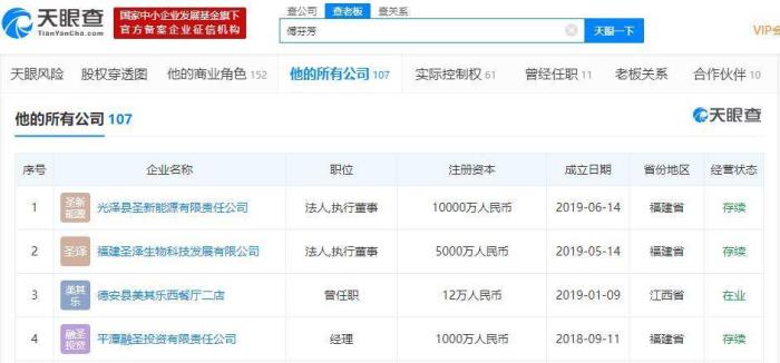 值得注意的是,傅芬芳名下公司多达107家,是父亲公司数量的近6倍。不过,这些公司多为餐厅、快餐店,注册资本仅几万、十几万元,且有很多处于注销状态。