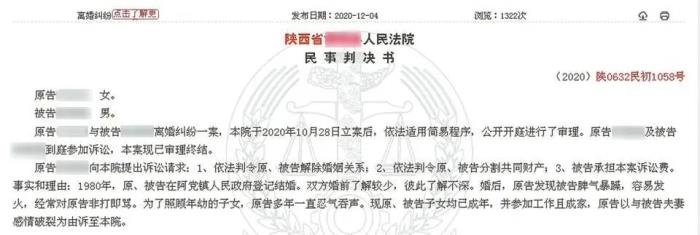 12月初,一份(2020)陕0632民初1058号民事判决书显示,原告王花与被告杨某某离婚纠纷一案于2020年10月28日立案。原告向法院提出诉讼请求,请求依法判令其与丈夫解除婚姻关系、分割共同财产。
