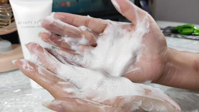 首先我们来看护肤的第一个步骤,也就是礼盒中的这个水肌美净肤美颜膏,它就类似于我们日常使用的洗面奶,根据官方介绍水肌美净肤美颜膏内含了13种氨基酸成分,使用的时候你会发现水肌美净肤美颜膏很温和,不会刺激皮肤,且有效清洁毛孔中的污垢,它的泡沫也比普通的洗面奶要浓密许多,轻轻的在手掌搓揉几下就有很多泡沫出来了。
