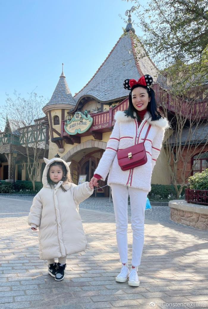 第二张图片,是刘彦池戴着米老鼠的头箍和女儿拉着手的合影,身材姣好,肤白貌美,小彩虹也笑得很可爱,母女二人都选择了白色系的衣服,十分温馨。