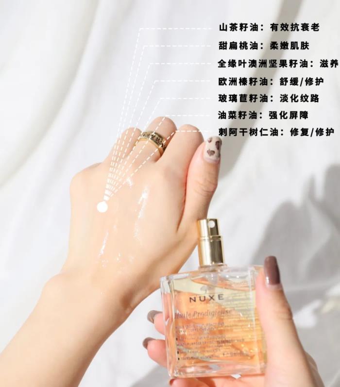 虽然它是油状质地,但它的流动性很强,推开以后非常清爽不黏腻,独家的DRY OIL技术可以打破重组分子,帮助皮肤更快吸收,一年四季,各种肤质都可以使用。