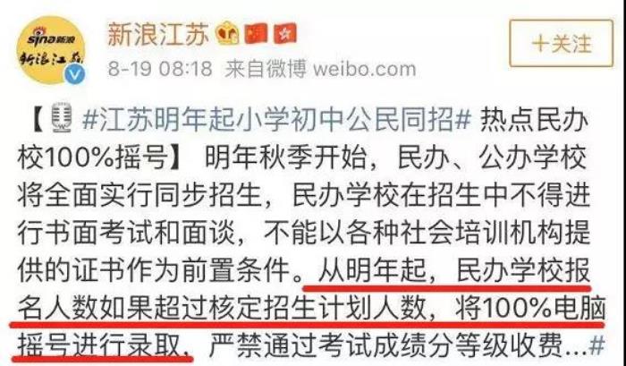 从明年开始,江苏的民办小学、初中将不允许采取其他任何考试、面测、面谈方式入学,报名人数超额的话将实行电脑摇号录取制。