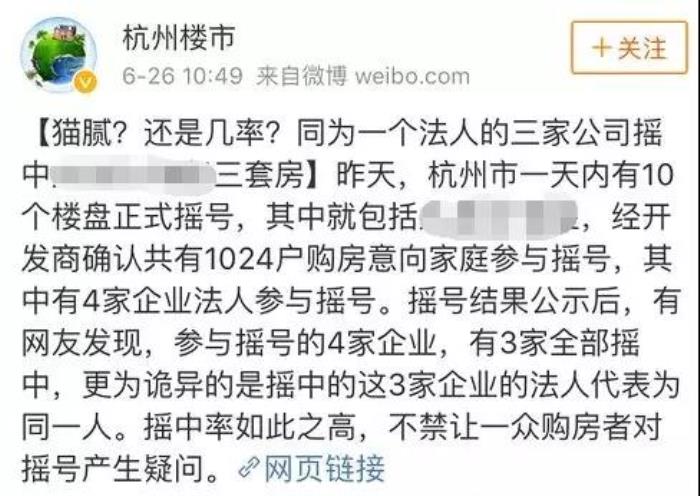 杭州则是有网友偶然发现,中签率极低的情况下,某楼盘有3家企业法人中签,而这三家企业的法人代表为同一人,极度的巧合引发了强烈的质疑。