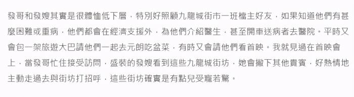 发哥夫妇与九龙城街市的档主成为了好友,知道档主有困难或重病,发哥除了在经济上支持外,还会为他们介绍医生,甚至开车送病者去医院。