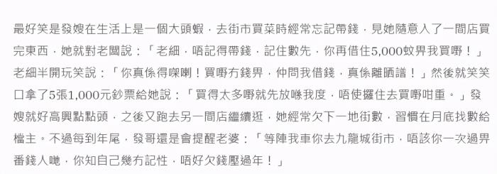 发哥生活规律,现在喜欢爬山,以前不用拍戏就在家里休息,不怎么说话,而发嫂偏偏相反,每天都说不停,表达欲超强,结果有时候夫妻吵架,发哥若其无事,发嫂就苦闷得跟狗狗聊天。
