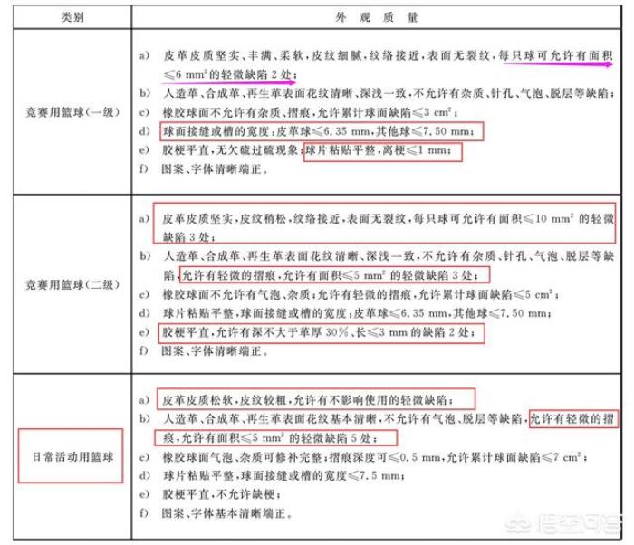 不同等级的球,在国家标准里,都是允许有外观上的缺陷的,具体在图中都有圈出,简单介绍一下日常活动用球。b,允许有轻微的褶痕,允许有5处面积≤5平方毫米的缺陷,e,不允许缺梗,这个梗,也就是我们看到的篮球每个皮片之间的黑色线条,那其实是内胆上的筋条,这里并未像竞赛用求一样要求接缝要小于多少,平时可能很多朋友买的某丁大品牌,高价格的球上,也是有非常明显的细缝的,这是正常的在允许范围内的,何况其他低价位的小品牌,多少都会存在一些宽度不一的细缝,这并不影响使用和球的质量,毕竟篮球都是手工贴成的。