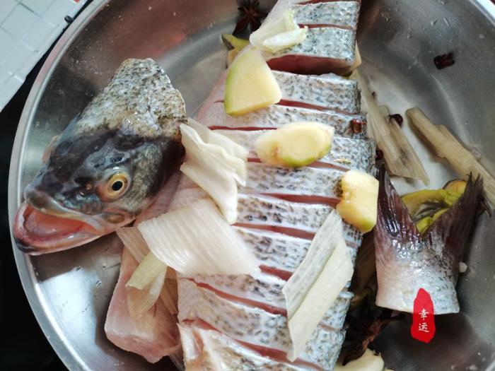 取个合适的大盘,将去掉头尾的鱼身体从一端开始摆成孔雀开屏状。再将鱼头、鱼尾摆好。腌制的各种调料就放在鱼的上面一起上锅蒸。
