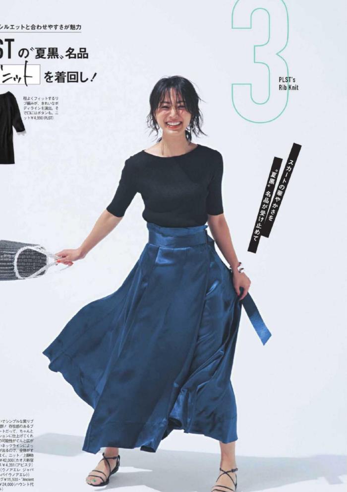 像这款黑色的针织上衣,它的款式较为修身一些,相较于宽宽大大的黑色单品来说,对个人曲线的烘托更加显著,更为出色。同时结合一款蓝色的缎面半身裙,通过腰间细节的处理来勾勒出腰身,会让你的身材变得很出众。