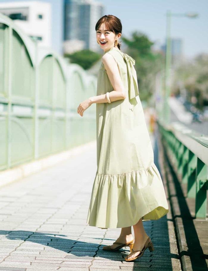 像这款裙装,它运用的色彩成为了其中最显眼之处,干净的绿色,不会创造出似黑白灰的单调感,还可以在后背的位置上加入飘带,自己选择不同的系法,垂落或是系成蝴蝶结,都是能够使它外观有变化,更飘逸。
