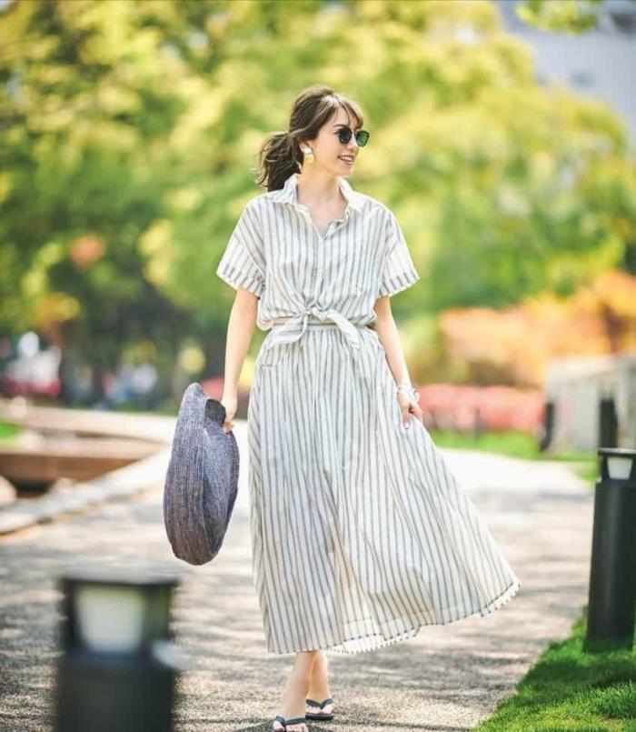 衬衫裙与成熟女生的穿衣风格十分贴合,也能够带来几分优雅风采。这款裙装还加入了竖条纹进行连接,丰富外观,拉长曲线,腰带勾勒腰肢,收窄腰围。