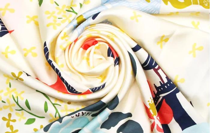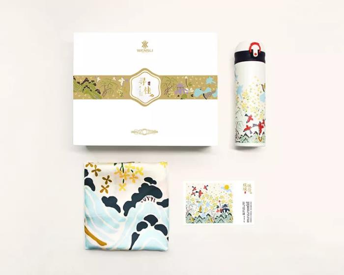高端国礼品牌万事利,将诗情画意的杭州复刻在了丝巾上,提取了著名的杭城四景:曲院风荷、三潭印月、双峰插云和柳浪闻莺。