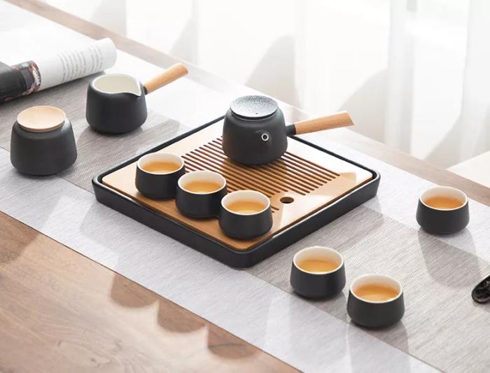以庄重沉稳的黑色为主调,将古典韵味和现代美感相结合,实木和陶瓷相衬托,让冰冷的茶器有了温度。