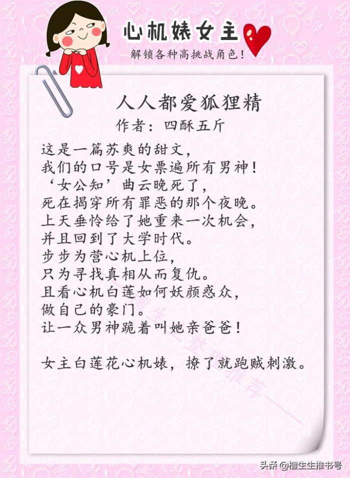 一起来欣赏这些演得了楚楚可怜白莲花、扮得了爱慕虚荣妖艳货、当得了清新脱俗绿茶妹的女主们,如何与腹黑强势的男主们斗智斗勇,并击垮这些天之骄子高高在上的尊严,使他们捧着一片真心俯首称臣的辉煌事迹吧!