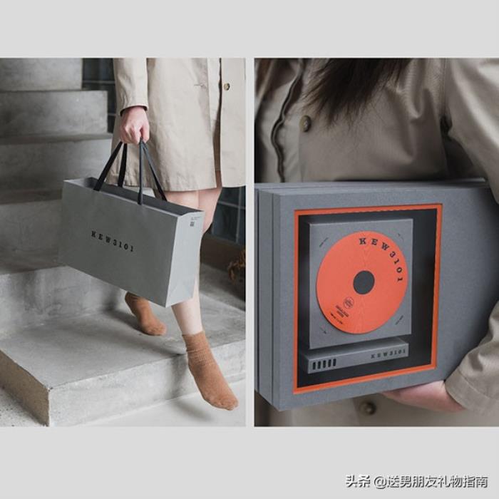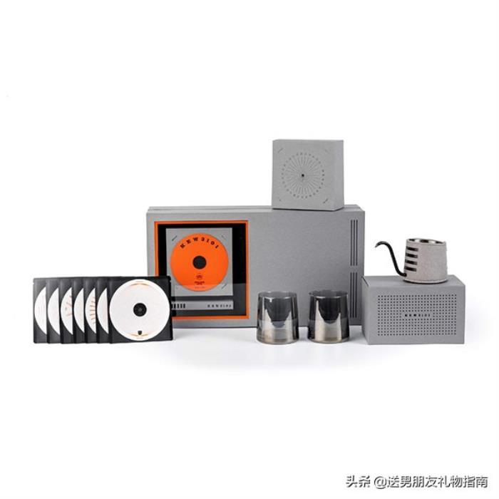 礼盒采用cd唱片元素设计,创意有调。橙色和浅灰搭配,高颜又有质感。礼盒圆盘上还可以定制祝福语。