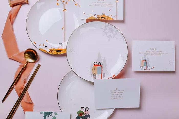 一组非常有爱的四季碗盘,上面的情侣插画很好看,描述了一屋二人三餐四季的幸福生活: