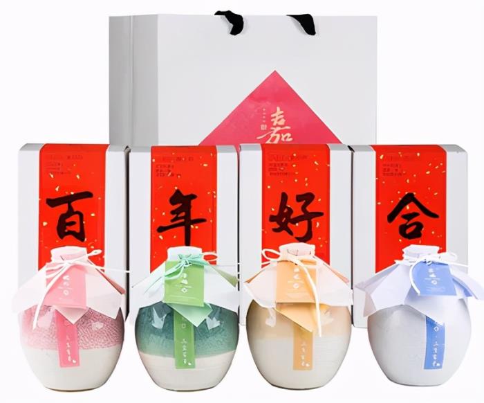 这款果酒礼盒送新人也很妙,祝福新人百年好合。包括青梅酒、桃子酒、桂花酒和荔枝酒4种口味。