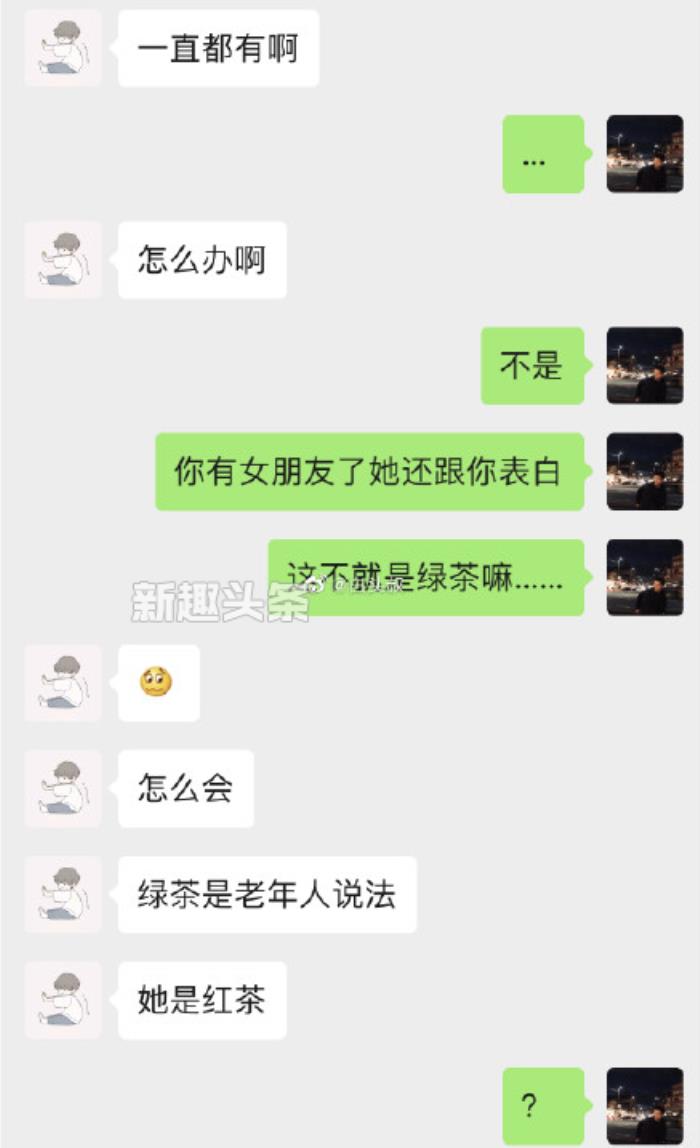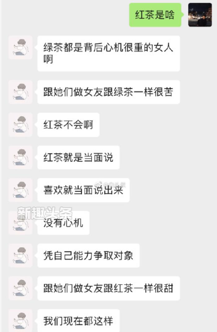 所谓的红茶女生,就是知道对方男生有女朋友,如果喜欢这个男生就会说出来,而且也会让那个男生的女朋友知道。和绿茶不一样的就是不会像绿茶一眼在暗地里搞小动作,红茶是明目张胆,光明正大的抢人了。这个梗就是出自微博上的一个话题,是由一位叫白头叔的博主发的聊天截图,反正大家看了之后就明白了!