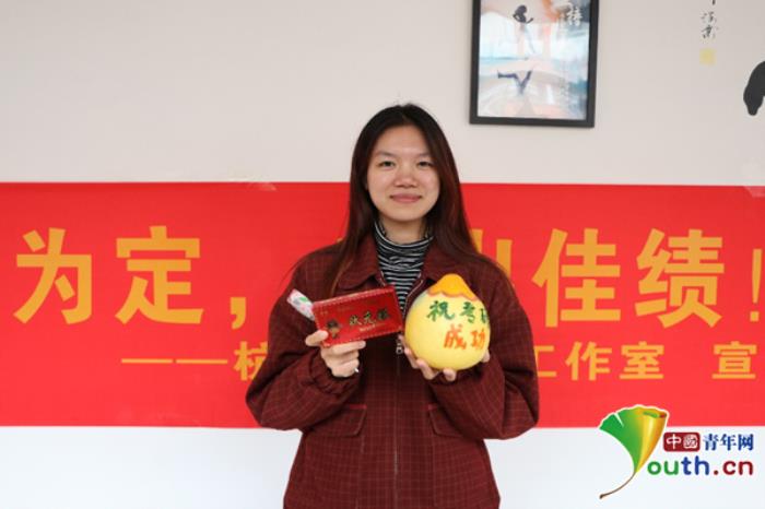 图为考研的同学收到“加油柚”。中国青年网通讯员 赵瑶瑶 范佳蕾 摄