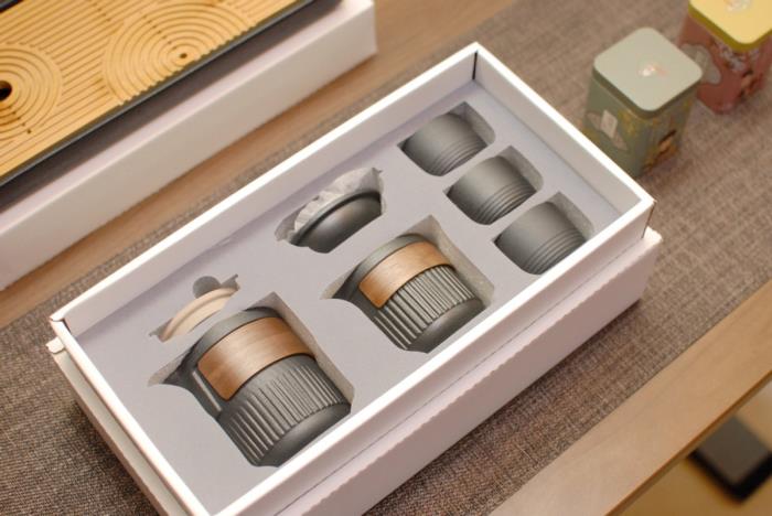 取出茶盘,下层则是茶壶、茶杯、公道杯等物件,分别以嵌入的形式包装着,保护方面还是挺周到的,我们一一取出细品看看。