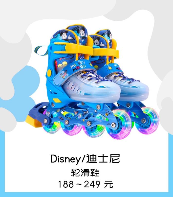 迪士尼这款轮滑鞋一样有各种颜色、卡通人物可选,米老鼠、冰雪奇缘和蜘蛛侠,根据小朋友不同的喜好买就行。里面也包括头盔、护具和轮滑包——这一点很重要,孩子的安全第一。