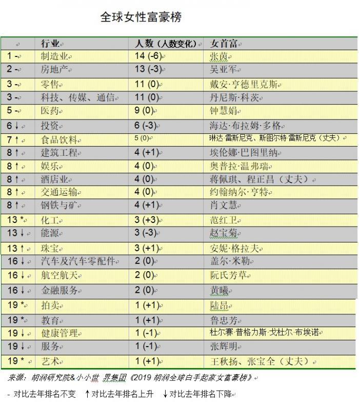 根据3月 7日发布《2019胡润全球白手起家女富豪榜》, 制造业仍然是全球白手起家女富豪最主要的财富来源,以14人排名第一。其次是房地产,有13人,再次是零售和科技行业,分别有11人。
