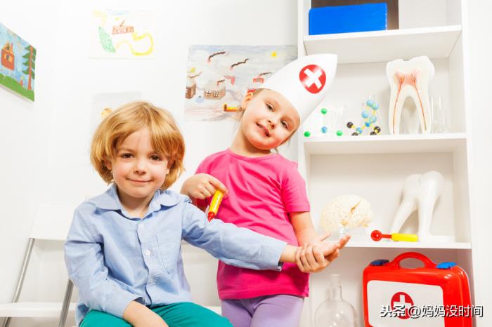 我们可以在家里购买或自制一些角色扮演的玩具和道具,比如仿真的水果、医生护士的工具,用纸板做“公交车”,用围巾做超人的斗篷等,多陪孩子玩这类游戏。