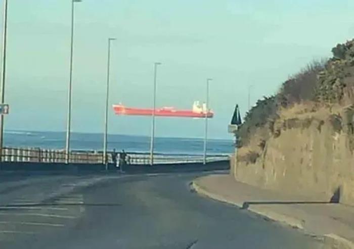 其实这样的案例并不罕见,今年的3月份,英国就发生过一次网友目击轮船悬浮在空中的事件,它的形成道理也是类似的,都是一种因为颜色接近产生的一种错觉。