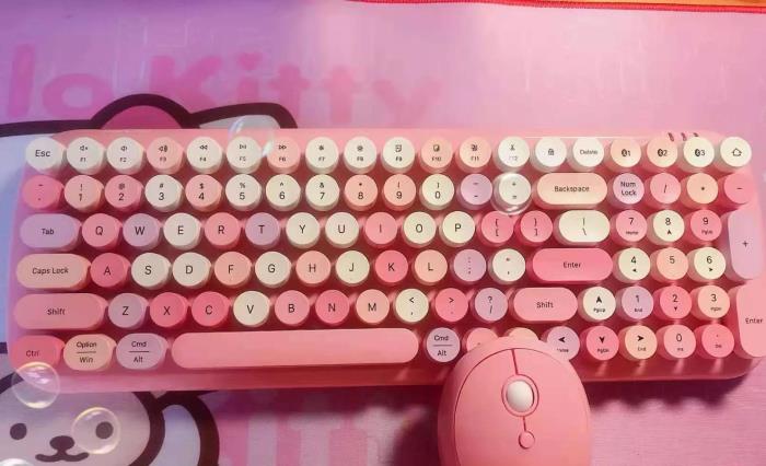 必入少女心好物,超级粉嫩超级好看!而且手感很好是机械的感觉会有咔塔咔嗒的声音!鼠标小小的也很好握住,键盘按键都有弧度,为手指打字时候的舒适度提供了保障!手指肚正好吻合键盘形弧度。蓝牙操作方便打开就可以连上适配苹果,联想等电脑。