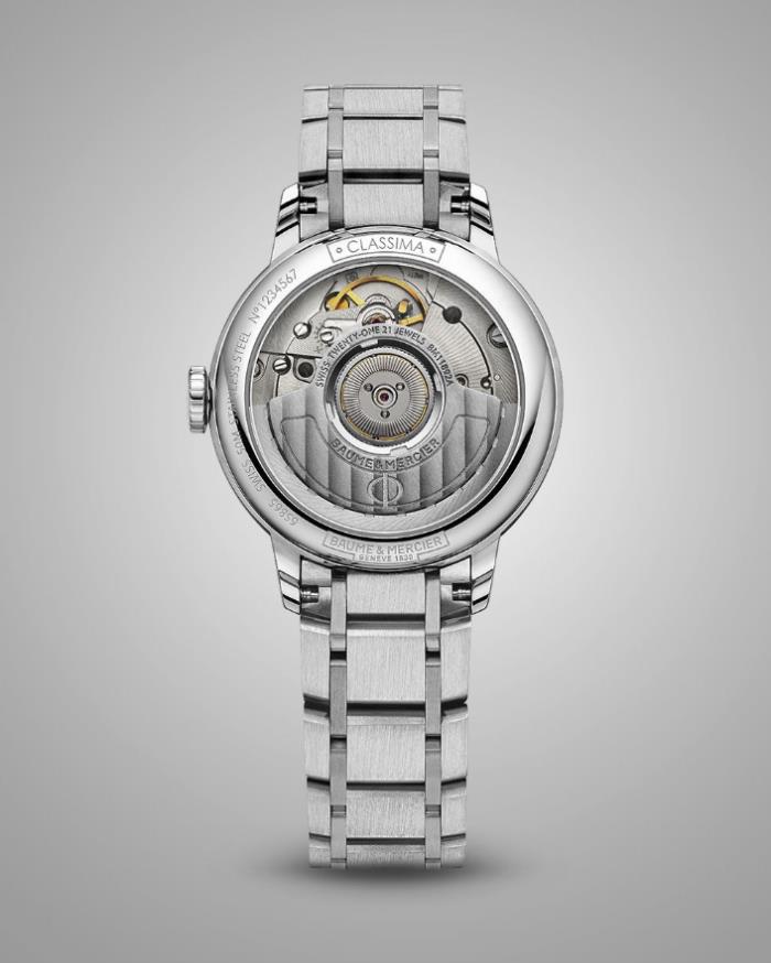 名士(Baume&Mercier Classima)是精致而优雅的缩影的表圈装饰有60颗明亮式切割钻石,可增强其豪华魅力。白色的珍珠母贝表盘巧妙而精致,在六点钟,九点钟和十二点钟处有罗马数字,三点钟处有日期窗口。精致的叶子形指针指向时间,镀铑,即使在弱光条件下也可以读取时间。瑞士制造的ETA 2892-A2自动机芯以28,800vph的速度跳动,内部装有21颗珠宝,可使手表自动运行42小时。腕表的精钢表壳尺寸为31.5毫米,并配有透明底盖,使人们可以欣赏机芯。它的两侧都覆盖有蓝宝石水晶,增强了其耐用性。抛光金属表链使这款优雅时计的外观更加完美,该设计旨在牢记现代女性的风格。