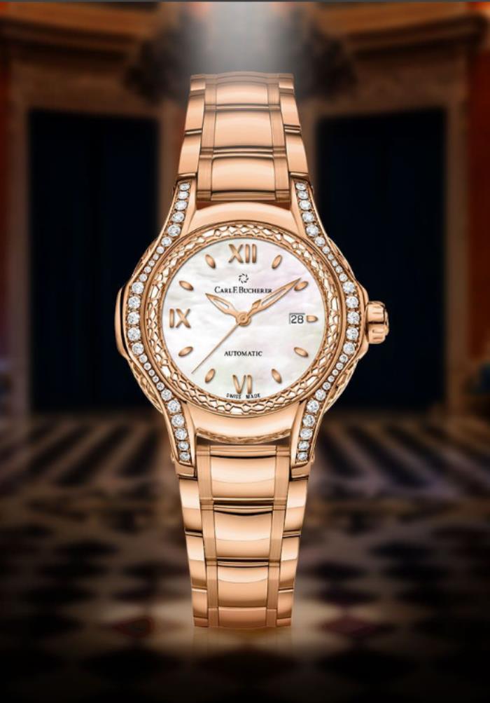 时髦女人的诗意颂歌, CarlF. BuchererPathosDiva手表在闪亮的魅力和优雅的内敛中走出一线辉煌。PathosDiva的灵感来自于它在表圈两侧和表耳上共切割了54颗明亮钻石。白色的珍珠母贝表盘在三点钟位置设有日期显示孔,可确保手表不会进入夸张的区域。搭载25枚珠宝的CFB 1963自动上链机芯,Pathos Diva具备38小时的动力储存,这对于美丽女人来说是完美的。蓝宝石水晶底盖让您一窥内部持久的机芯。表盘周围的丝状图案增强了手表的精致外观。
