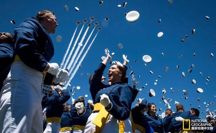 科罗拉多州 | 美国空军雷鸟飞行表演队正低空飞过,科罗拉多斯普林斯空军学院的毕业生们把帽子扔到一边,庆祝毕业典礼。