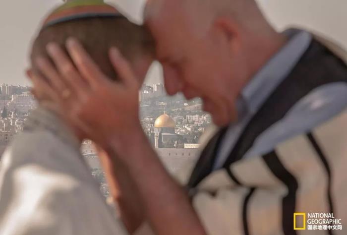 以色列 | 在耶路撒冷,一位拉比(犹太人中老师与智者的象征)正在祝福一个13岁的男孩,庆祝他的成年礼。这意味着从此以后,这个男孩将承担起成年犹太人的责任。背景中,阳光照亮了圆顶清真寺的金色穹顶。这是中世纪的伊斯兰教圣地,建于圣殿山上,这也是犹太圣殿的旧址。