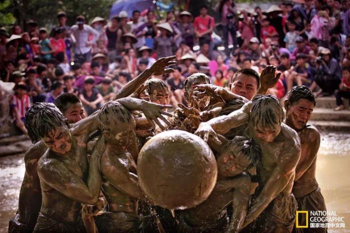 越南 | 这些人正在扮演侍奉村庄保护神的战士,在这个有着几百年历史的庆典上,他们全身是泥,正和一只木球斗智斗勇。