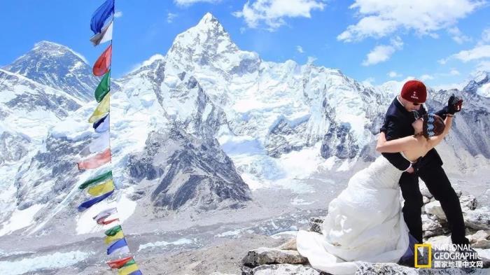 尼泊尔 | 这对夫妇正在庆祝纪念日,每年他们都会在新的地方穿上他们的结婚礼服。珠峰大本营见证了他们结婚五周年。