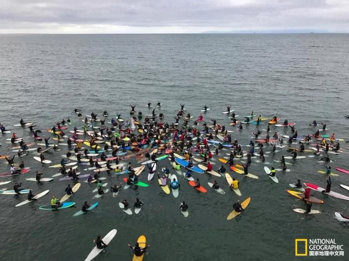 加州 | 在亨廷顿海滩,冲浪者们聚集在一起“划水”,这项传统是为了纪念一位已过世的冲浪伙伴:这个年轻人在车祸中不幸丧生。人们一边动作一致地划水,一边呼唤死者的名字。