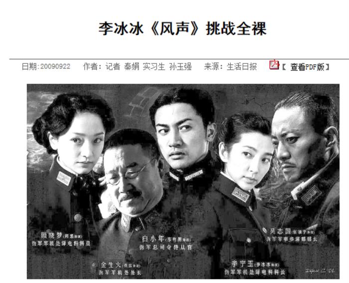 在《风声》中,李冰冰有13分钟的裸戏,导演说用替身吧,李冰冰说不用,要亲自挑战,结果入戏后当场失声痛哭,拍摄完毕后,李冰冰坦言《风声》是这些年来最受煎熬的一部戏。