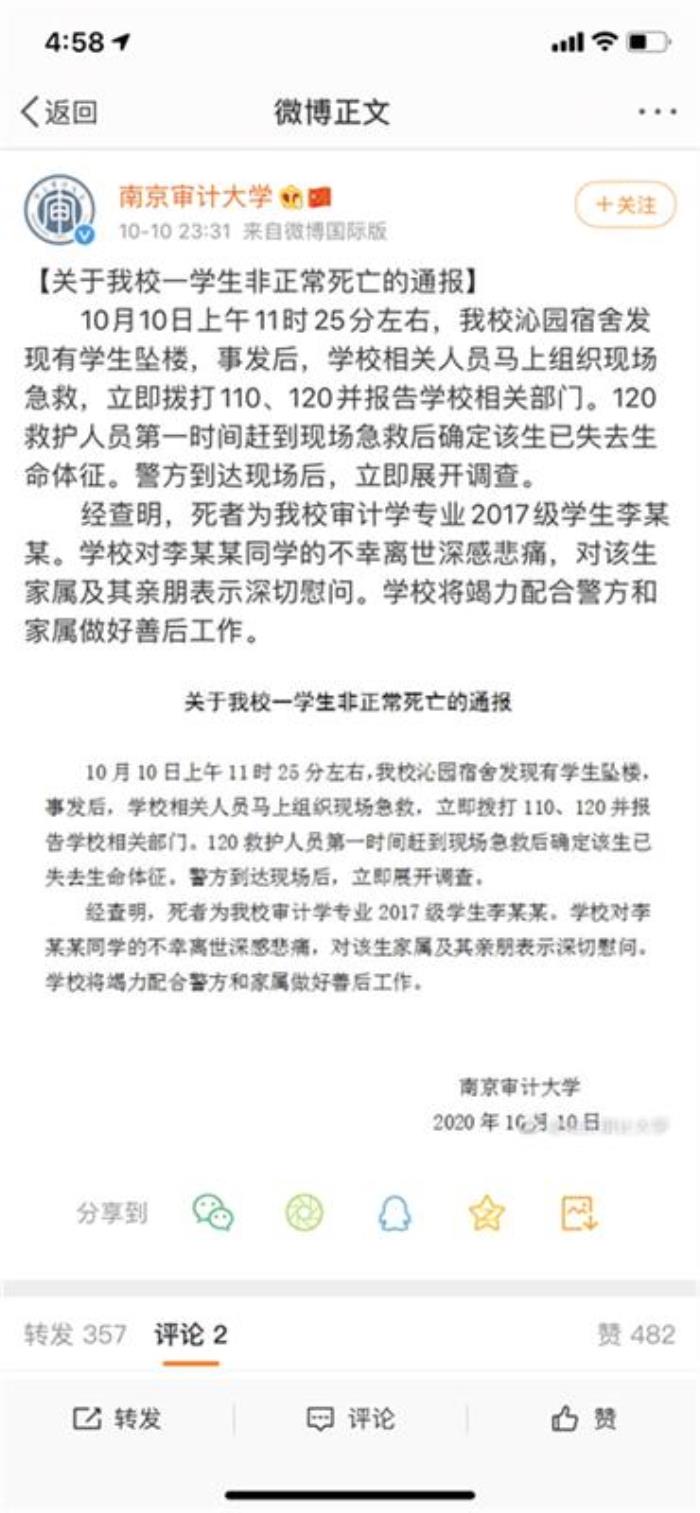 楚天都市报10月11日讯(见习记者曾凌轲 记者刘闪)10月10日晚11点半,南京审计大学官方微博发布通告称,10日上午11时25分左右,学校沁园宿舍发现有学生坠楼。事发后,学校已组织救助。经查明,死者为该校审计学专业2017级学生李某某。目前警方已展开调查。