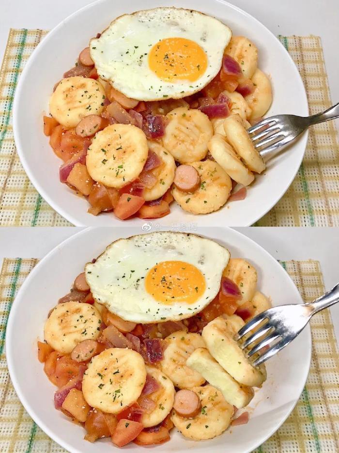 4.先煎个蛋备用。锅中刷油,炒香洋葱、香肠,下番茄炒软出汁,加入番茄酱、盐,加入土豆丸子煮一会,最后加入黑胡椒粉