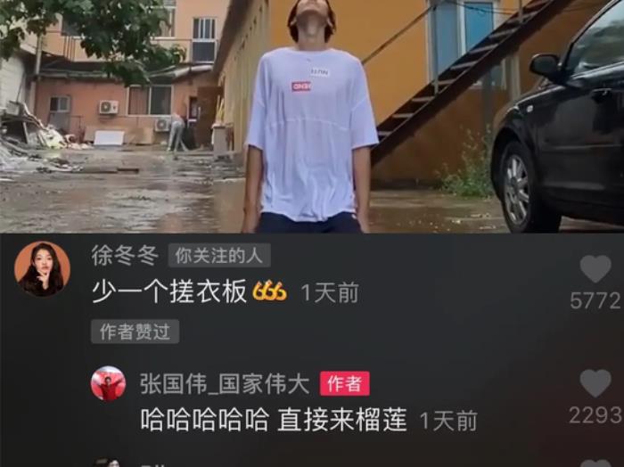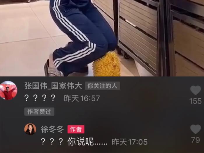 再后来两人的互动越来越多,甚至还以“老板”“老板娘”来互相称呼,这就不免让网友们猜想连连。而在最近一次是张国伟发布了一段在雨天跪地淋雨的视频,还配上了一首伤感的苦情歌做背景音乐,徐冬冬也在视频下方留言道“少一个搓衣板”,之后张国伟回复徐冬冬“直接来榴莲”。在这之后,徐冬冬也发了一条在超市里挑选榴莲的视频,还亲自试了一下合不合适。因此也有网友开始留言道“这是给张国伟准备的”,至此徐冬冬和张国伟之间的关系开始受到网友的猜测。