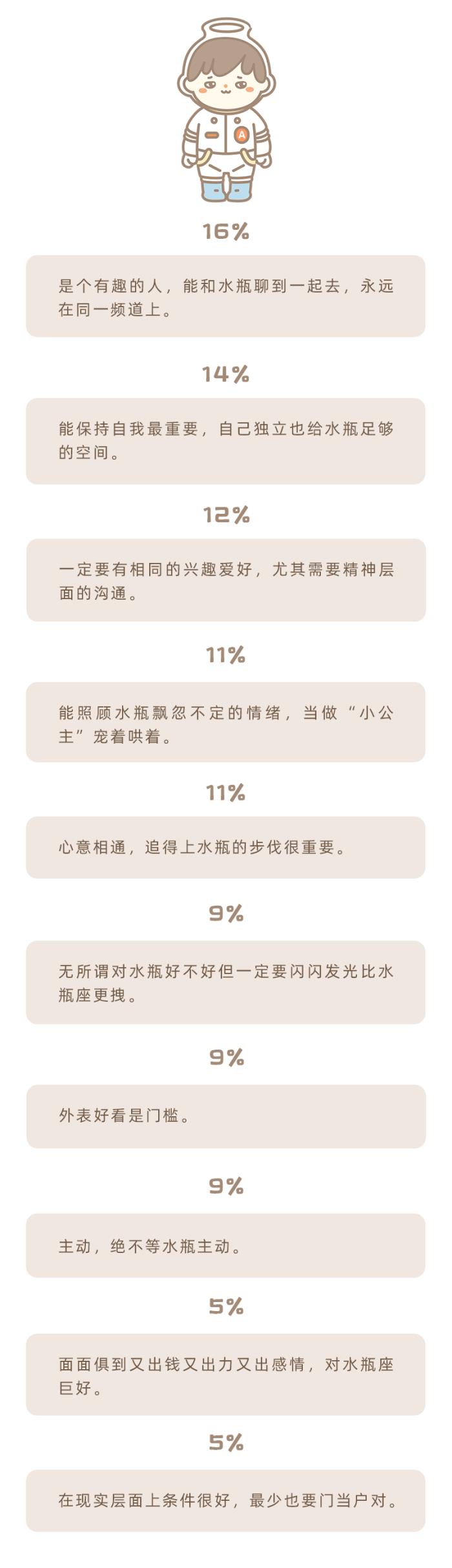 那水瓶座肯定立刻有了跟你讨论的兴趣,觉得你厉害,觉得能和你聊到一起去。就是水瓶座对什么感兴趣,你必须起码和他们在同一个水平,最好还能快他一步,这基本就满足了投票最高的第一项——能和水瓶座聊到一起去。当然水瓶座的兴趣转得非常得快,希望你能尽量跟上他们的步伐。在这里还要特别提醒一下,千万不要对一件事其实没什么兴趣,但是为了和水瓶座套近乎假装有兴趣,很快就会被水瓶座揭穿,且会给他留下巨大的坏印象。